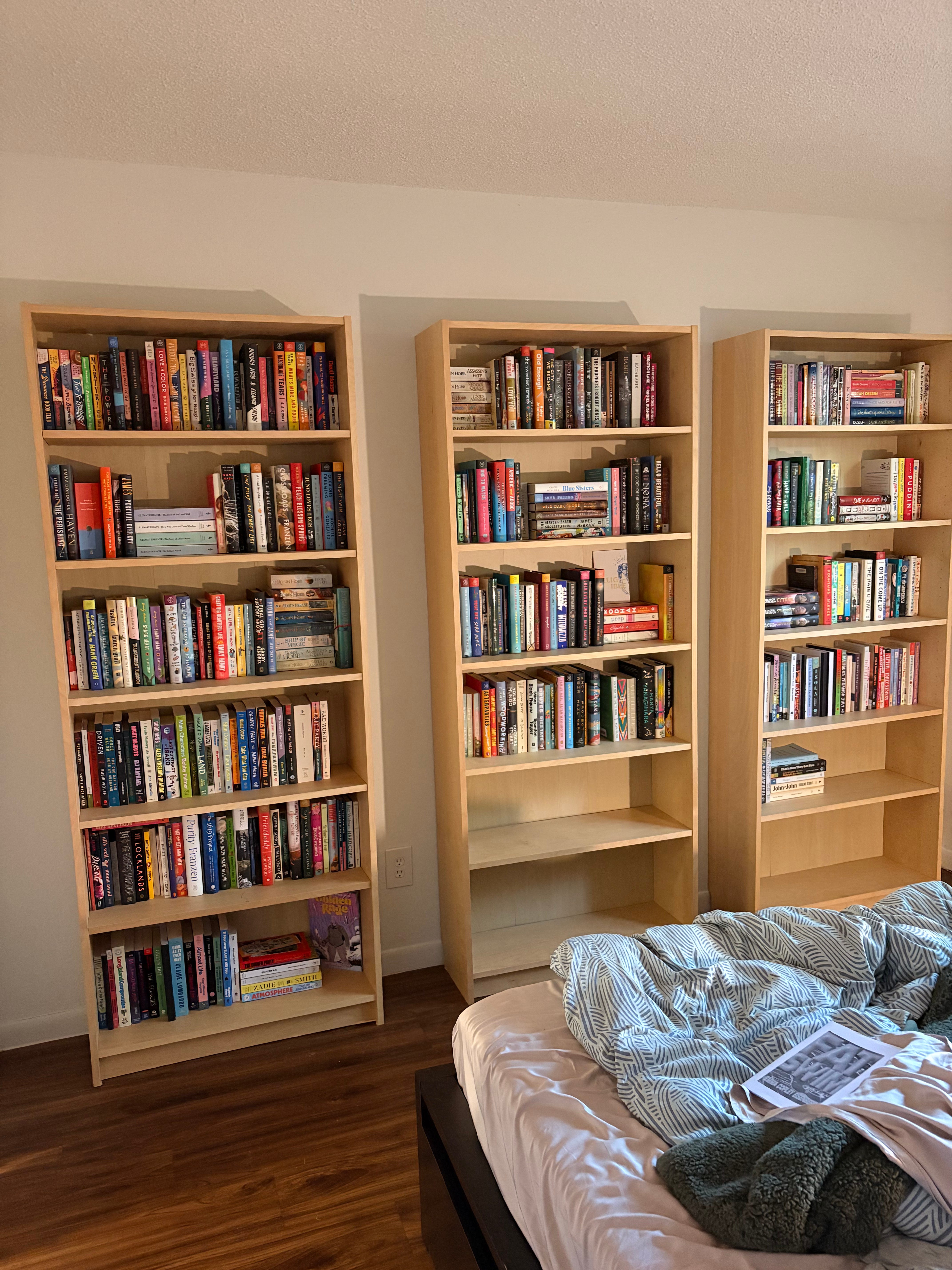 Since I moved into this apartment last spring, I’ve kept my books in stacks along the walls of my room. This looked cool, but it was also pretty unruly. I had to stack them depending on size, to make sure they were stable, but I actually prefer them to be in alphabetical order. So getting the shelves and organizing my books has felt like one thing in my life I can actually control. I’ve got my read books, YA and Adult, all in alphabetical order. I’ve got three ARC shelves (one for books I haven’t read that aren’t out, one for books I haven’t read that are, one for books I have read), and a TBR shelf for any finished copies of books I have. I even have room for more books, which felt crazy after seeing them all pushed together the night before. Plus, the bookshelves somehow make my room look bigger. Maybe having furniture other than my bed in my room makes actual sense?